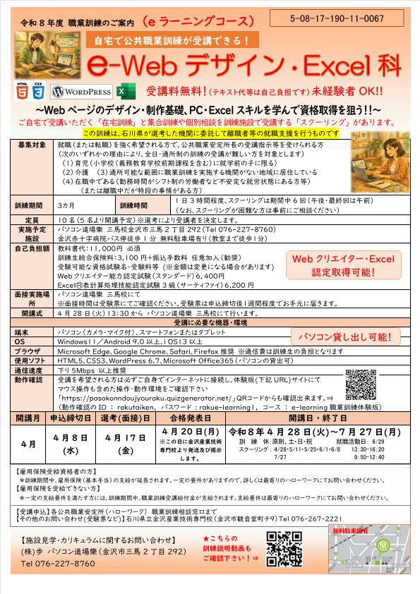 令和8年度の職業訓練 e-Webデザイン・Excel科(eラーニング)募集中です。