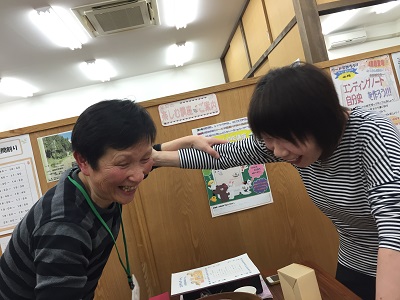 「これ、積み重ねて、崩さないで取れた人だけ食べれるがにしよ~!」