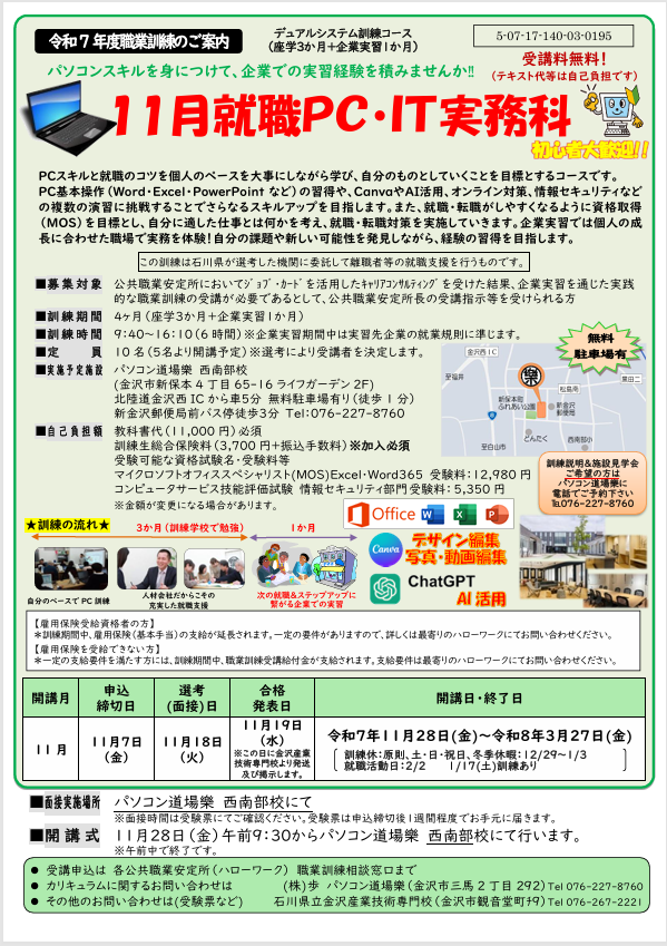 令和7年度の職業訓練「11月就職PC・IT実務科」が募集開始となりました。